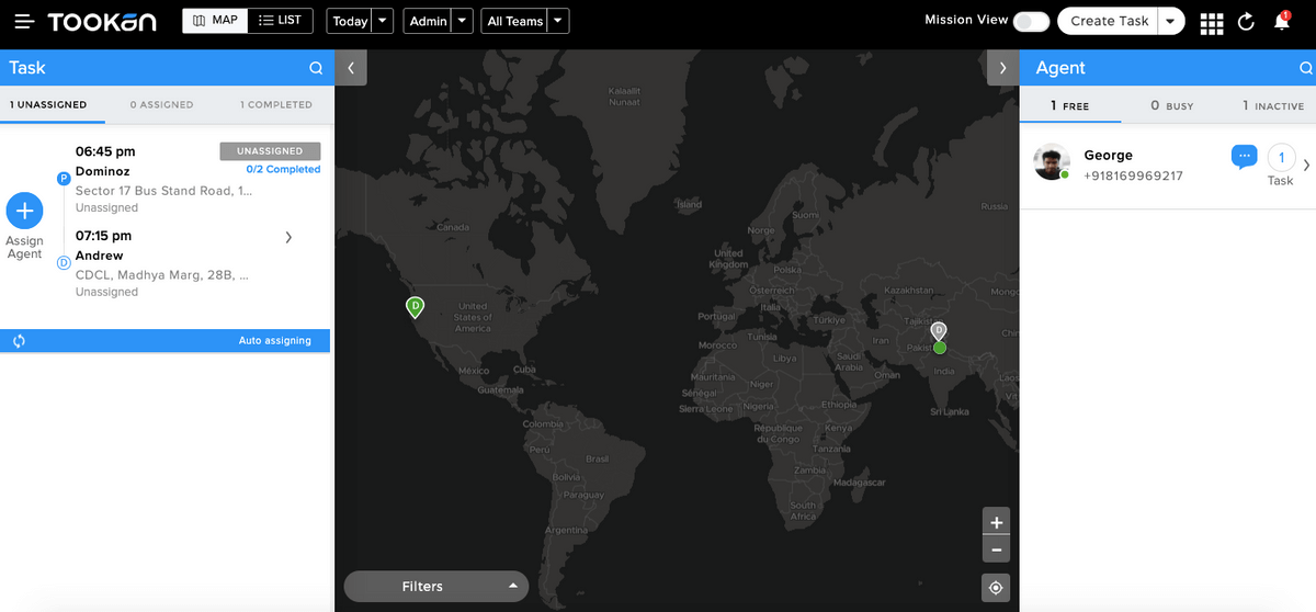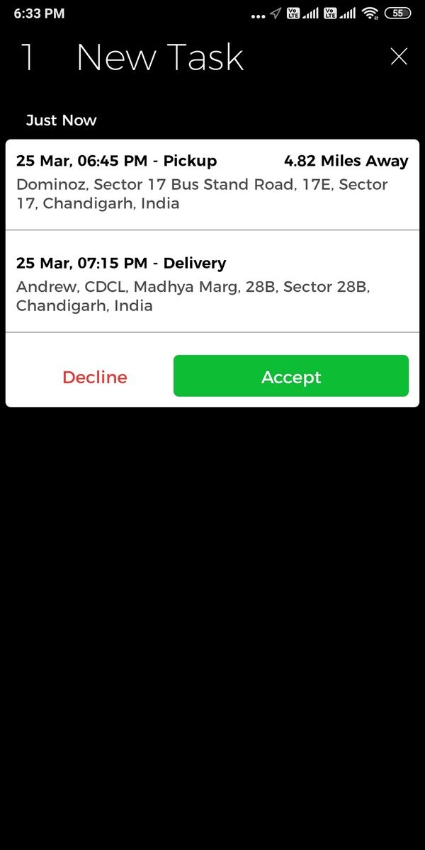 Once the order is accepted by the merchant, the task is created for delivery with the pick-up and drop locations.